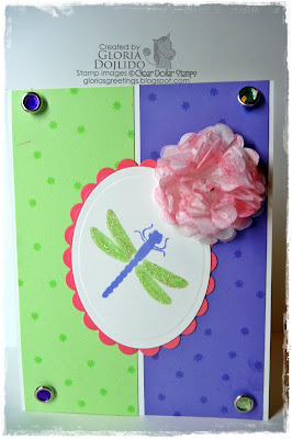 What a pretty card, Gloria...the little dragonfly is sooo pretty and what a fabulous fluffy flower ...love how you combined all those challenges into this one beautiful design!!!